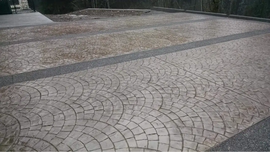 Flowing lines of dark, exposed aggregate create a striking border around a European fan stamped concrete driveway in Bellevue.