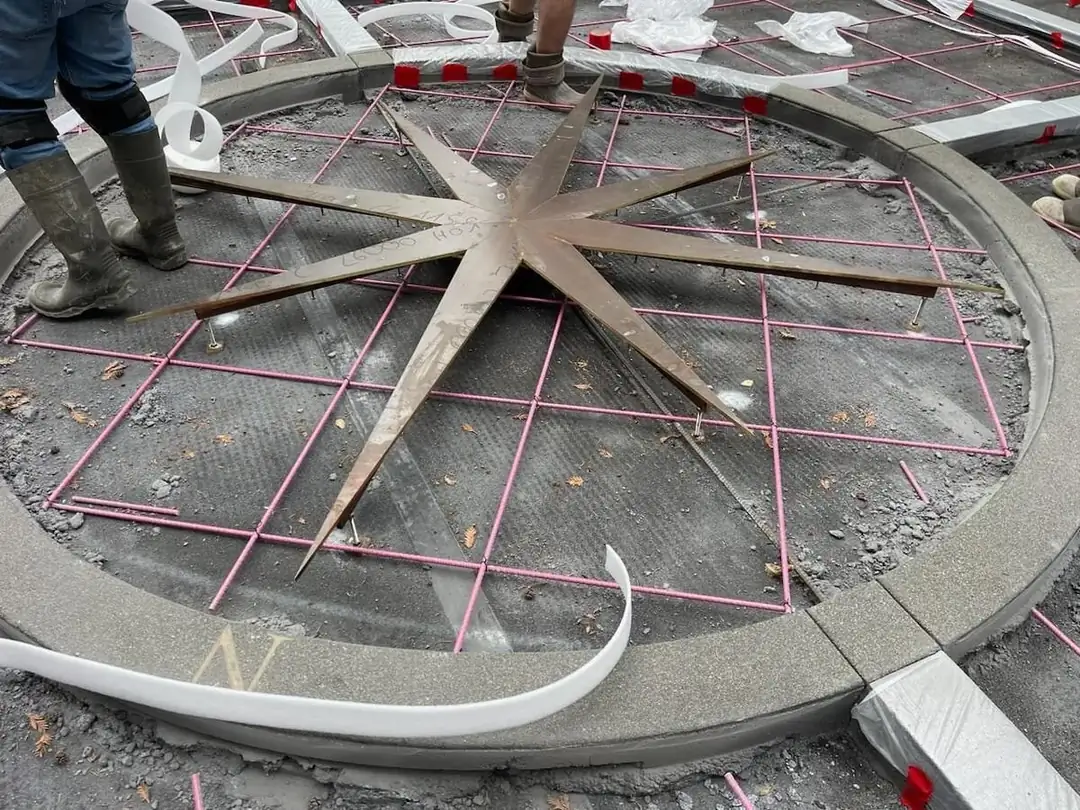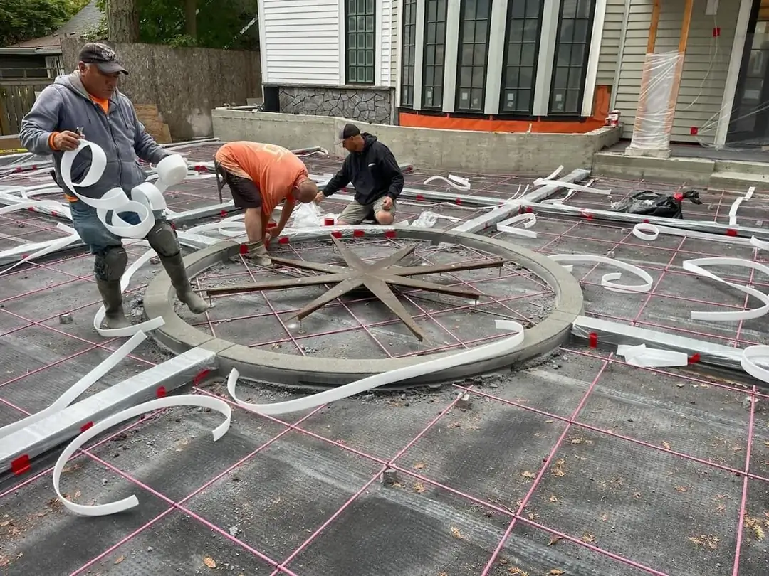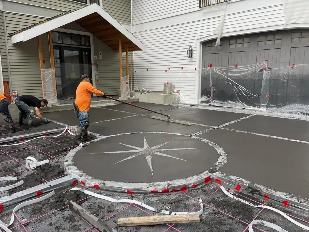 A stunning, custom-stained compass rose inlay serves as the focal point for this expansive concrete driveway in Bellevue. The design's artistry is grounded in the contrast between the deep charcoal concrete pads and the warm, golden hues of the central medallion. A precise grid of saw-cut control joints provides a strong geometric frame that directs the eye toward the custom artwork, while also ensuring long-term structural integrity. The main surfaces feature a light broom finish, offering excellent traction and a subtle texture that complements the smooth, detailed finish of the compass. This project required an exceptional level of craftsmanship, from the complex, multi-layered formwork built to create the crisp circular and linear elements, to the careful application of color that gives the compass its life and dimension. The result is a functional surface elevated to a piece of bespoke art.