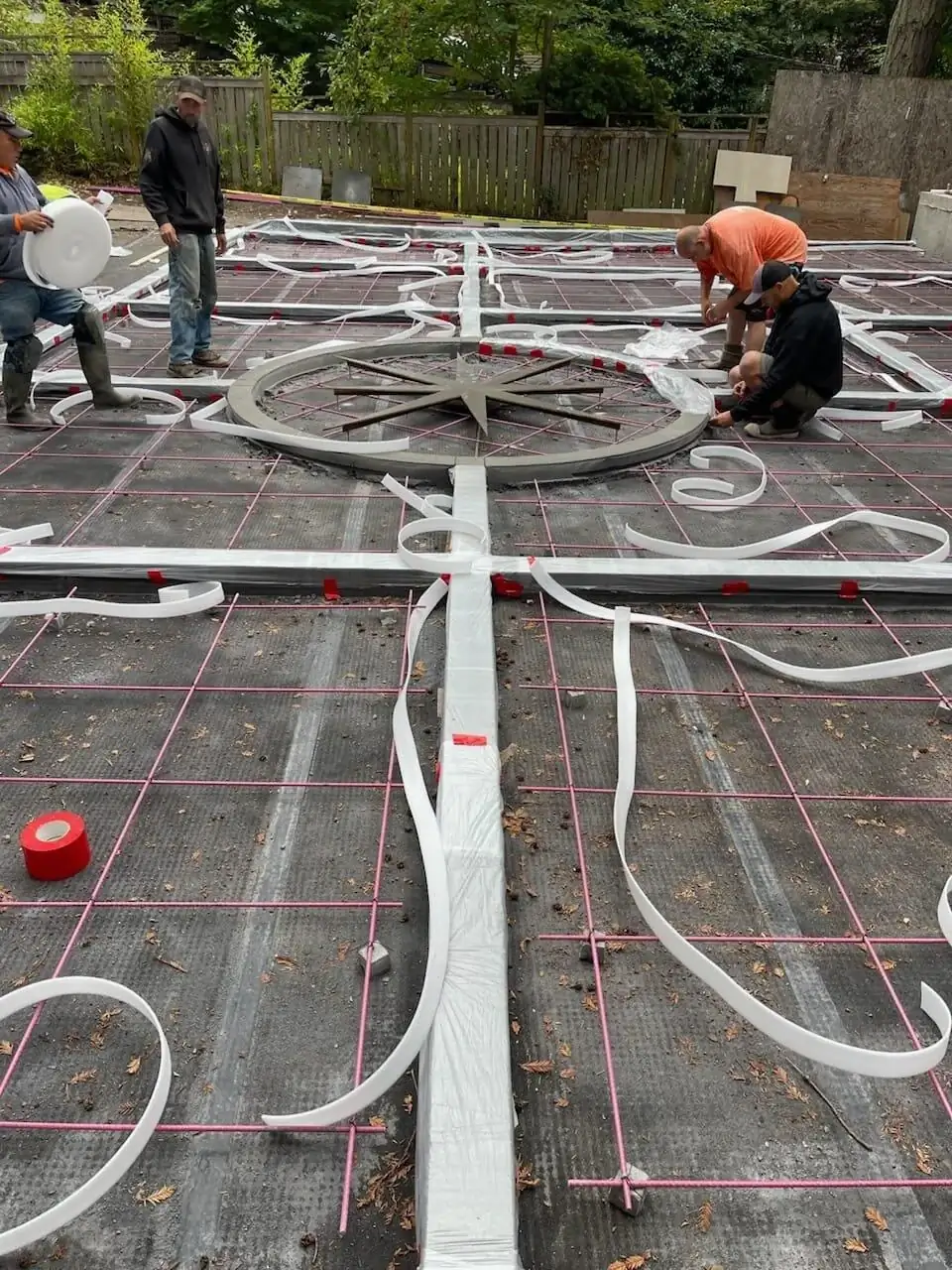 A stunning, custom-stained compass rose inlay serves as the focal point for this expansive concrete driveway in Bellevue.