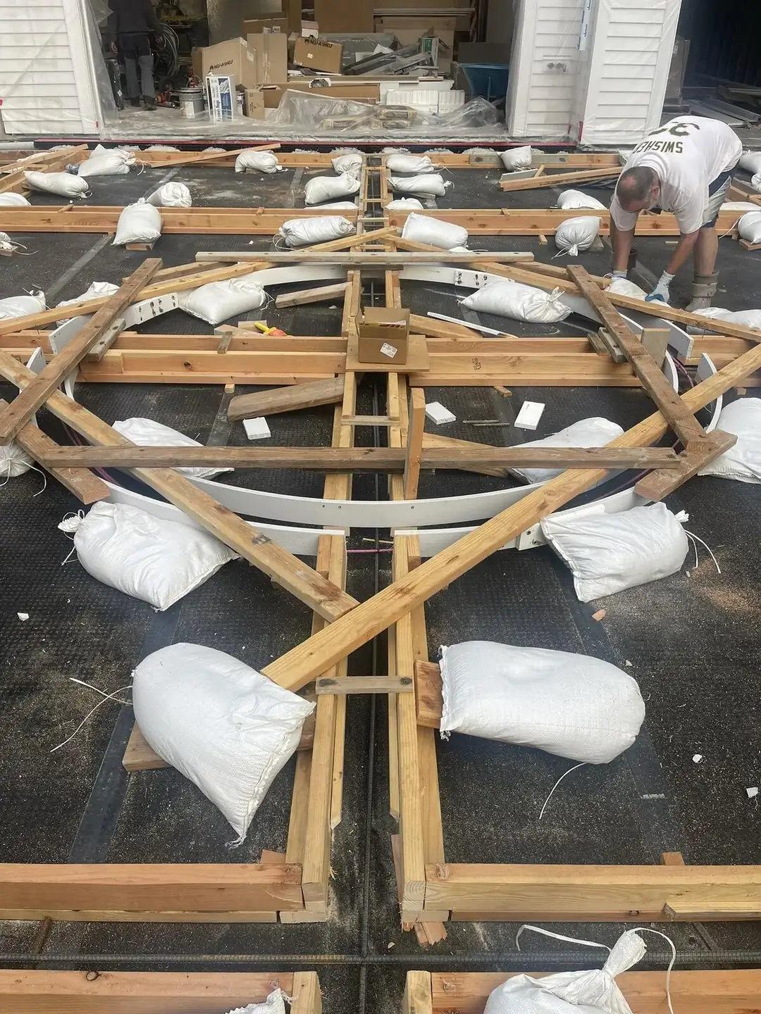 The full scope of the geometric design is visible during the pour.