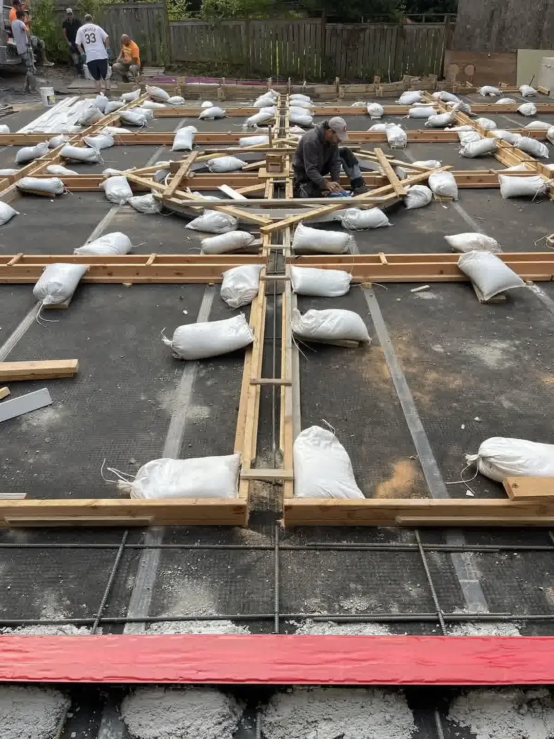 A coordinated team works to finish the concrete before it sets.