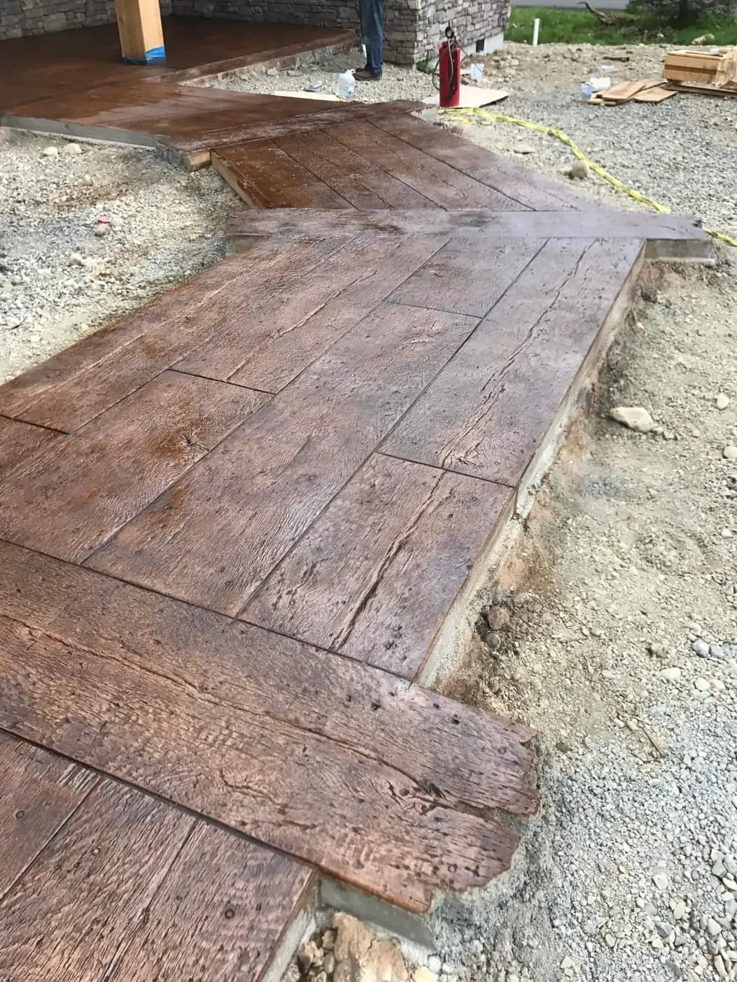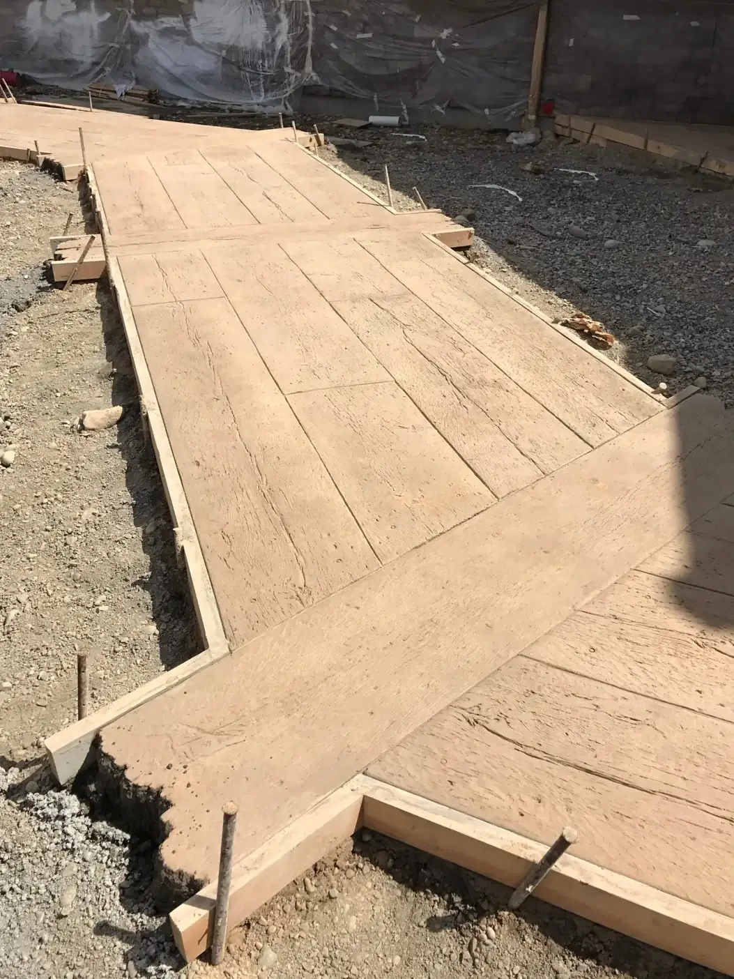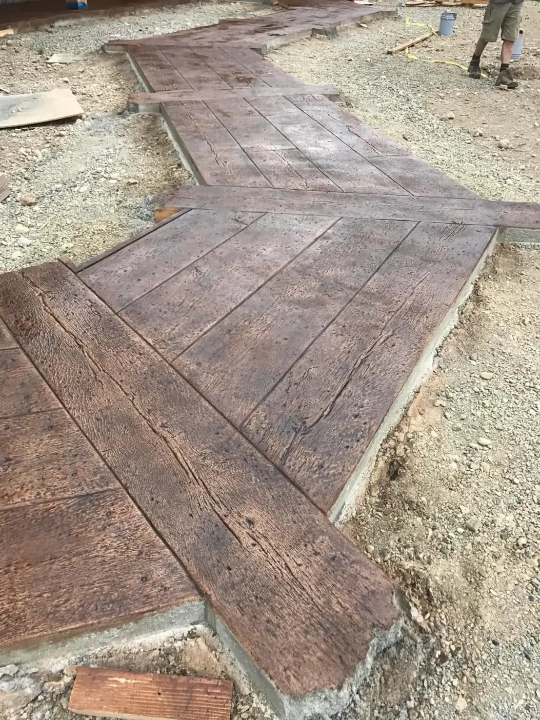 A rustic wood plank stamped concrete walkway in Bellevue provides a durable and artful approach to this craftsman-style home's main entrance. The surface delivers a convincing interpretation of aged timber, achieved through a detailed stamping process and a multi-toned staining application. The primary reddish-brown color of the main planks is contrasted by darker, grey-toned perpendicular planks that create visual structure and break up the linear path. Close inspection reveals deep grain textures and simulated knots, adding to the authenticity of the finish. The work extends to a covered front porch, creating a unified entry experience. In-progress images confirm the meticulous formwork required to execute the intersecting plank design, a testament to the precision involved. The finished walkway is thoughtfully bordered with river rock, integrating the hardscape into the surrounding landscape design.