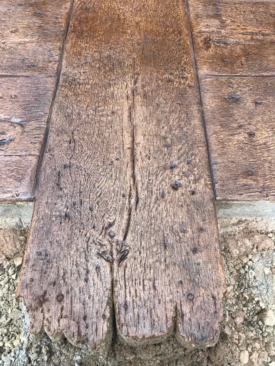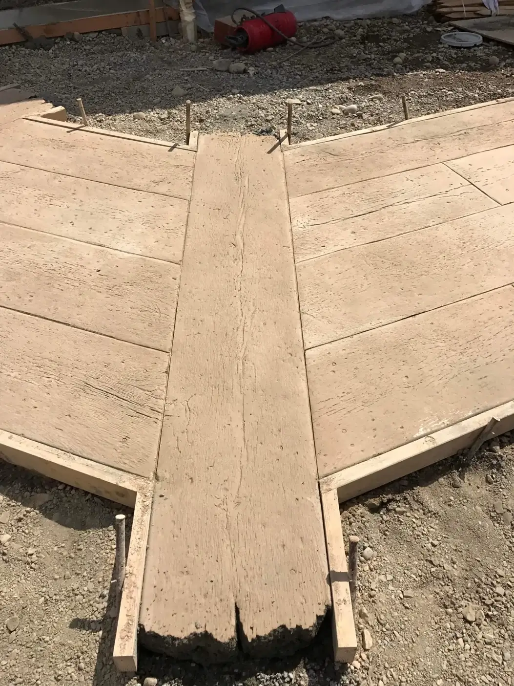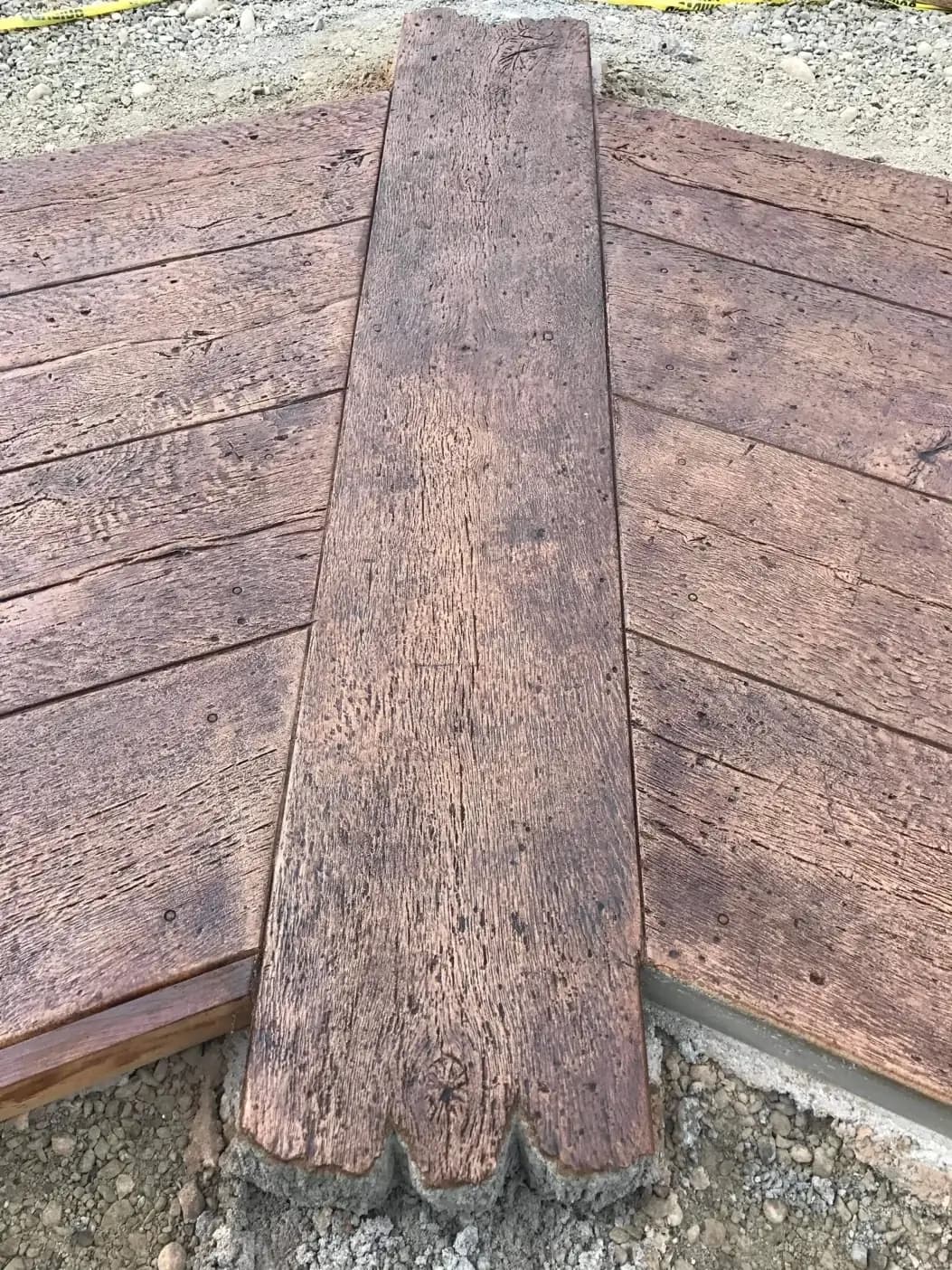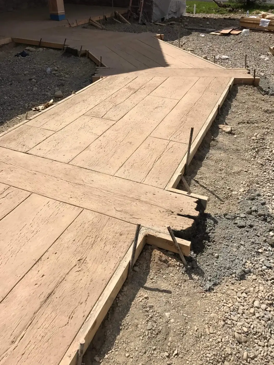 A rustic wood plank stamped concrete walkway in Bellevue provides a durable and artful approach to this craftsman-style home's main entrance. The surface delivers a convincing interpretation of aged timber, achieved through a detailed stamping process and a multi-toned staining application. The primary reddish-brown color of the main planks is contrasted by darker, grey-toned perpendicular planks that create visual structure and break up the linear path. Close inspection reveals deep grain textures and simulated knots, adding to the authenticity of the finish. The work extends to a covered front porch, creating a unified entry experience. In-progress images confirm the meticulous formwork required to execute the intersecting plank design, a testament to the precision involved. The finished walkway is thoughtfully bordered with river rock, integrating the hardscape into the surrounding landscape design.