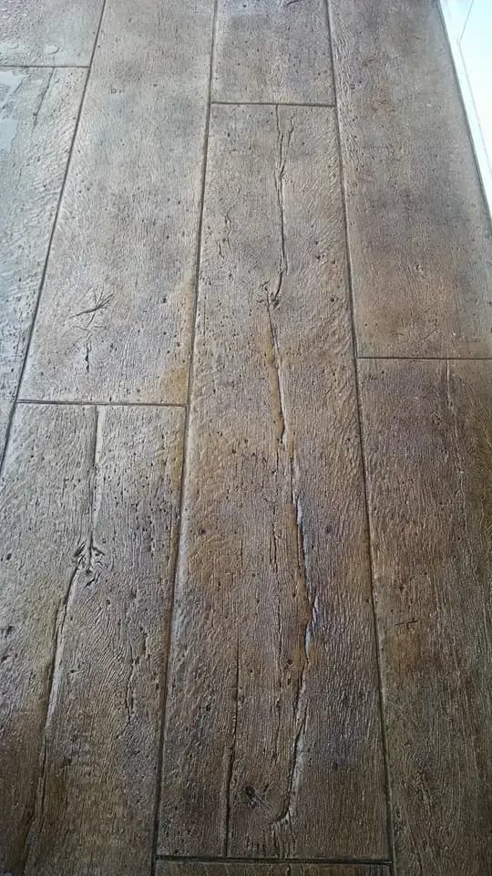 A rustic wood plank stamped concrete walkway in Bellevue provides a durable and artful approach to this craftsman-style home's main entrance.